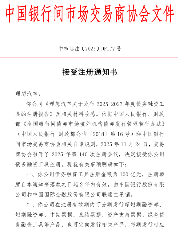 【大河财立方消息】2026年1月4日,中国银行间交易商协会公告,接受理想汽车债务融资工具注册,金额为100亿元,注册额度自2025年12月3日起2年内有效,由中国银行和中金公司联席主承销。