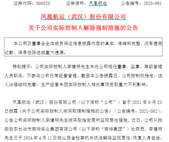 1月4日,凤凰航运发布公告称,近日从控股股东长治市南烨实业集团有限公司处获悉,公司实控人李建明已于2024年4月11日被山西省检察机关依法解除监视居住,恢复人身自由。