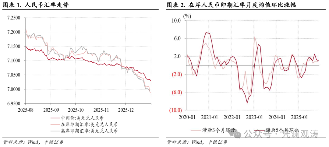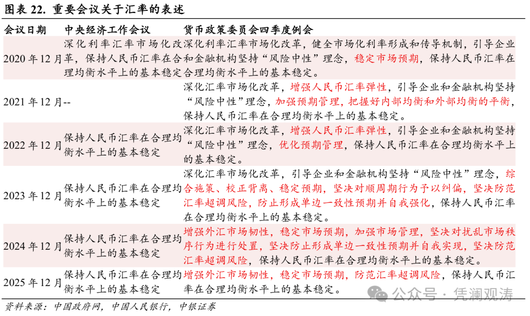 2025年底中央经济工作会议连续第四年强调“保持人民币汇率在合理均衡水平上的基本稳定”,为历史上首次。结合历年中央经济工作会议之后的货币政策委员会四季度例会通稿看,2025年四季度例会关于汇率维稳的具体表述有所变化,删除了此前两年“坚决对顺周期行为予以纠偏”“坚决对扰乱市场秩序行为进行处置”以及“防止形成单边一致性预期并自我实现”等表述。这主要得益于2025年人民币汇率贬值压力总体趋缓,境内外汇市场供求状况明显改善。不过,由于外部环境不确定难预料因素仍然较多,四季度例会重申“增强外汇市场韧性”“稳定市场预期”和“防范汇率超调风险”,表明2026年汇率政策目标仍然是防范人民币汇率过度升值或贬值,为国内经济运行提供相对稳定的货币环境(见图表22)。