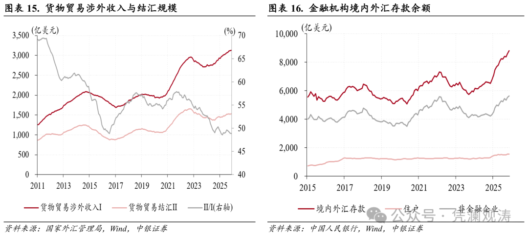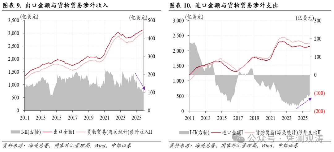 11月份,货物贸易项下,海关统计的贸易顺差环比增加216亿至1117亿美元,为历史第三高,与可比口径的涉外收付款顺差缺口扩大至+381亿美元。不过,从12个月移动均值看,2024年下半年以来,伴随着人民币贬值压力缓解,出口收款加快、进口付款放缓,导致货物贸易“顺差不顺收”状况总体趋于改善(见图表9、10)。