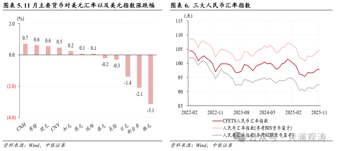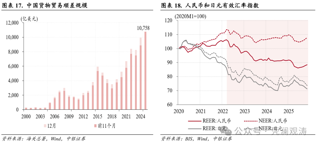 2025年前11个月,人民币实际有效汇率指数累计下跌3.2%,叠加中国货物贸易顺差规模突破万亿美元大关(见图表17),招致了国际社会对中国汇率政策的关注。多家外资机构认为人民币汇率存在低估,并且以美国前财政部官员布拉德·塞策为代表,认为人民币升值可以提振收入进而刺激消费和服务业,以此为由呼吁人民币大幅升值。