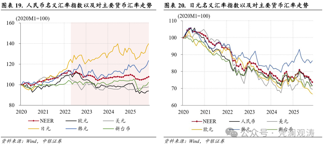BIS公布的实际有效汇率指数是基于消费者物价指数,因此实际有效汇率变化可以分解为名义有效汇率和消费者物价指数变化。2022年4月至2025年11月,人民币实际有效汇率指数累计下降16.7%,同期人民币名义有效汇率指数仅下降5.1%,表明中国通胀水平低于贸易伙伴是人民币实际汇率走弱的主要原因。相反,本轮日元实际有效汇率指数下行趋势始于2020年6月,截至2025年11月累计下行32.9%,同期日元名义有效汇率指数累计下行30.2%,是实际汇率走弱的主要原因(见图表18)。