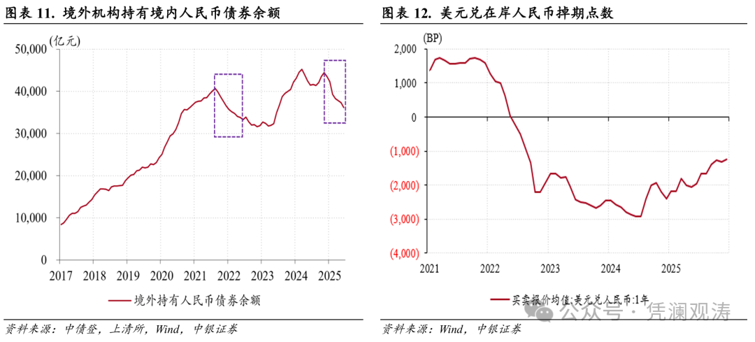 境内债券市场开放至今,外资持有人民币债券余额共经历了两个阶段的持续下降:第一个阶段是2022年2月至11月,第二个阶段是2025年5月至今。与上一阶段相比,虽然本次持续时长略短,但外资持仓回撤速度更快,持债余额单月降幅为1188亿元,大于上一阶段单月降幅740亿元(见图表11)。这主要源于近期美元对在岸人民币掉期点上行导致外资套利空间被显著压缩(见图表12)。