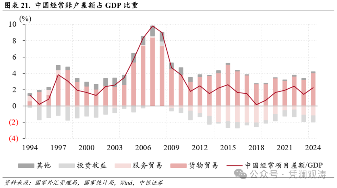 判断汇率是否高估或低估是相对于均衡汇率而言,而非简单参照历史数值。本轮人民币实际汇率走弱主要源于国内供强需弱、物价持续处于低位。促进经济稳定增长、物价合理回升,恢复对内经济平衡,才是防止对外失衡加剧的根本之策。1994年人民币汇率并轨后,中国经常账户出现持续顺差,并且顺差规模显著扩大。2007年、2008年,中国经常账户顺差占GDP比重分别为9.8%、9.0%,远超国际认可的合理范围。此后,经常账户顺差占GDP比重总体下降,2009年骤降至4.8%,2010年之后持续维持在4%以下,主要体现了“扩内需、调结构、减顺差、促平衡”的政策成效(见图表21)。同期伴随着人民币双边和多边、名义和实际汇率升值,更多是经济再平衡的结果(内生)而非工具。当前,在影响汇率涨跌的因素同时存在的情况下,若以引导人民币对美元升值来“减顺差、促平衡”,恐会加剧国内供强需弱的矛盾,强化物价下行的压力。