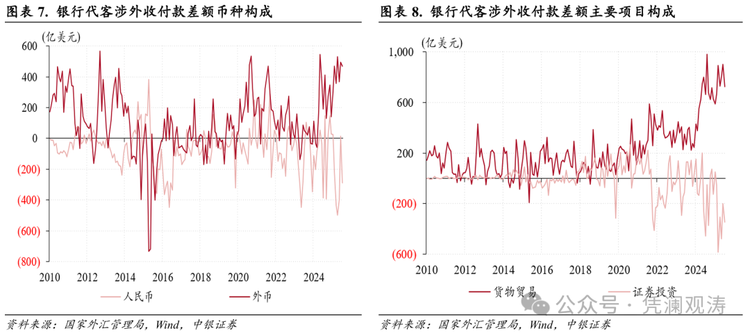 11月份,银行代客涉外收付款延续上月顺差,顺差规模由上月511亿美元骤降至178亿美元,并且低于此前两个月平均240亿美元的水平。分币种看,人民币涉外收付款由上月顺差16亿美元转为逆差290亿美元,贡献了银行代客涉外收付款顺差环比降幅的91%,而外币涉外收付款顺差基本稳定,环比仅回落29亿至467亿美元(见图表7)。