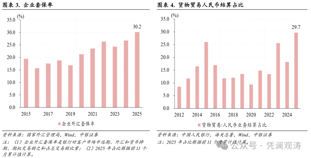 11月份,滞后3个月环比的即期汇率均值连续第九个月升值,涨幅为0.9%,为近四个月以来新高;滞后5个月环比的即期汇率均值则是连续第七个月升值,且升值幅度均超1%,表明近期人民币汇率升值或对出口企业财务状况负面影响加重。不过,在汇率维稳目标下,近三年即期汇率变化幅度明显收窄,对出口企业财务状况影响总体有限(见图表2)。而且,2025年前11个月,企业利用远期、掉期、期权等外汇衍生品管理汇率风险的规模已经达到1.75万亿美元,企业套保率较上年提高3.4个百分点至30.2%,货物贸易中人民币结算占比近30%,均创历史新高,有助于外贸企业规避汇率风险(见图表3、4)。