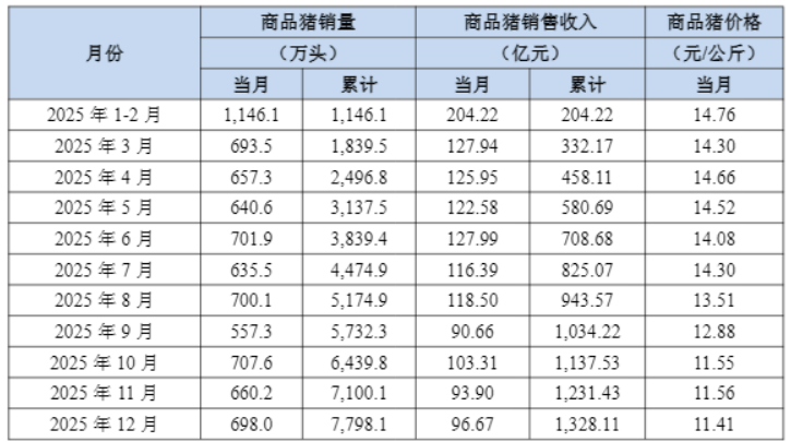 简报显示,2025年12月份,牧原股份销售商品猪698.0万头,同比变动-14.75%,其中向全资子公司牧原肉食品有限公司及其子公司合计销售商品猪339.0万头;商品猪销售收入96.67亿元,同比变动-36.06%。商品猪销售均价11.41元/公斤,同比变动-25.38%。