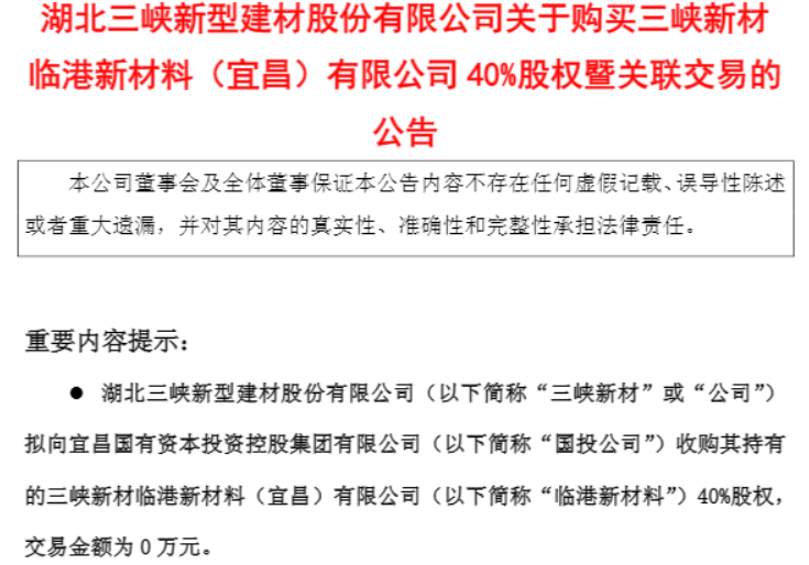 【大河财立方消息】1月5日,湖北三峡新型建材股份有限公司(证券简称:三峡新材)发布公告称,拟向宜昌国有资本投资控股集团有限公司(以下简称国投公司)收购其持有的三峡新材临港新材料(宜昌)有限公司(以下简称临港新材料)40%股权。