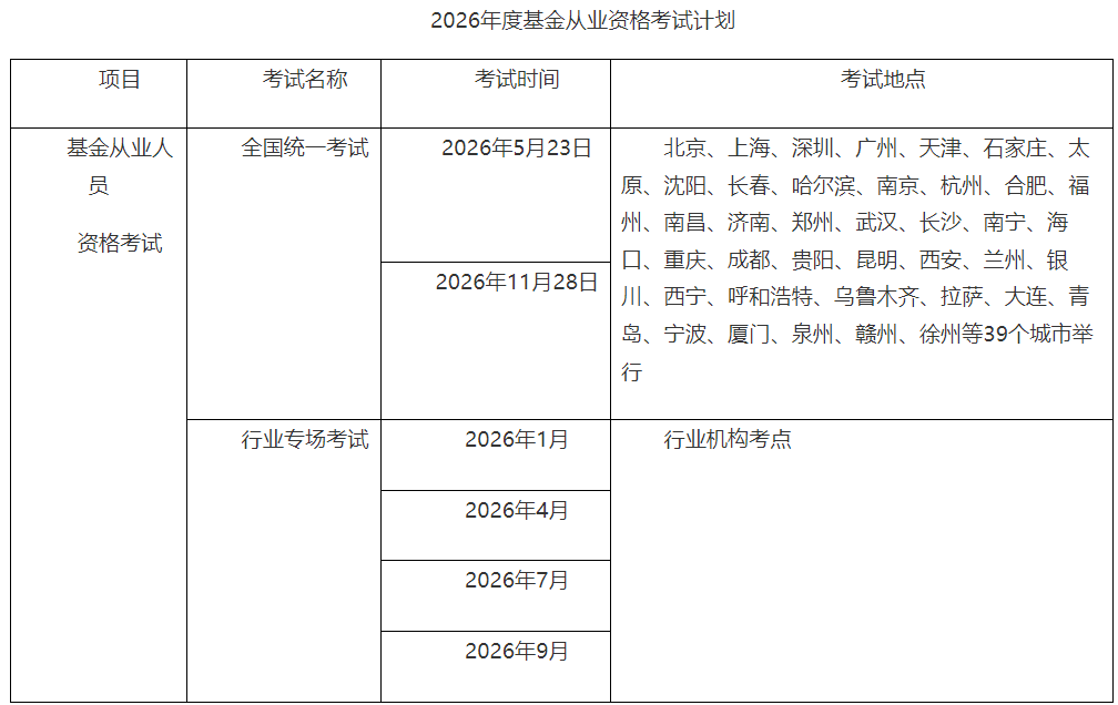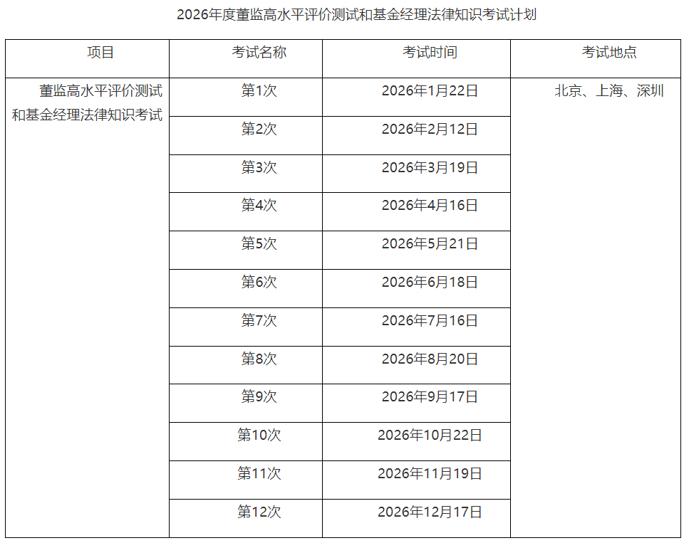 此前,中国证券投资基金业协会已公布2026年度考试计划:基金从业资格考试拟举办2次全国统一考试、4次行业专场考试;董监高水平评价测试和基金经理法律知识考试拟在北京、上海、深圳举办12次。