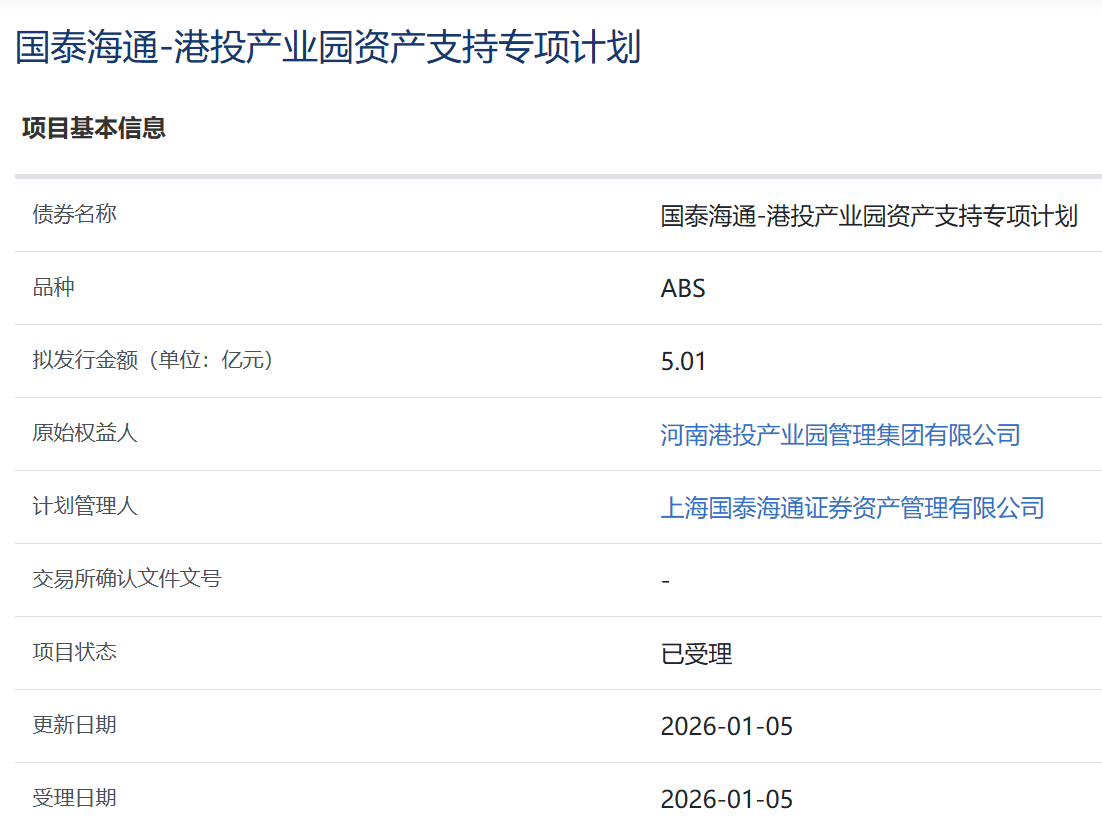 【大河财立方消息】1月5日,国泰海通-港投产业园资产支持专项计划获上交所受理。