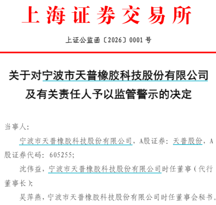 值得注意的是,2025年12月31日,上交所已向天普股份下发监管工作函,涉及对象为上市公司、董事、高级管理人员、控股股东及实际控制人;处理事由为关于宁波市天普橡胶科技股份有限公司涉嫌信息披露违规的监管工作函。