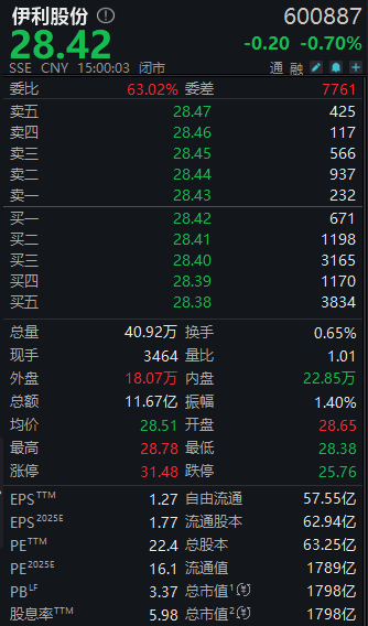 截至1月7日收盘,伊利股份股价28.42元/股。以此计,本次拟减持股份市值约17.62亿元。