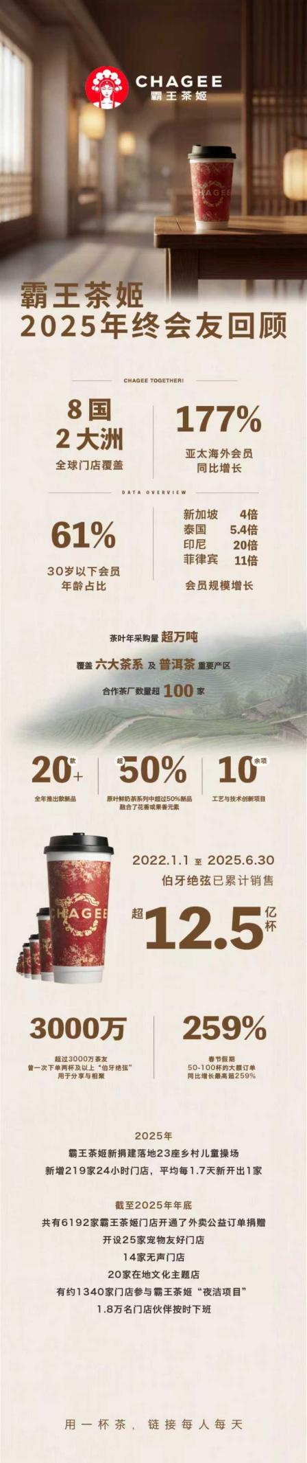 据《2025年终会友回顾》显示,2025年霸王茶姬新捐建落地23座乡村儿童操场,新增219家24小时门店,平均每1.7天新开出1家。截至2025年年底,共有6192家霸王茶姬门店开通了外卖公益订单捐赠、开设25家宠物友好门店、14家无声门店、20家在地文化主题店,有约1340家门店参与霸王茶姬“夜洁项目”,1.8万名门店伙伴按时下班。