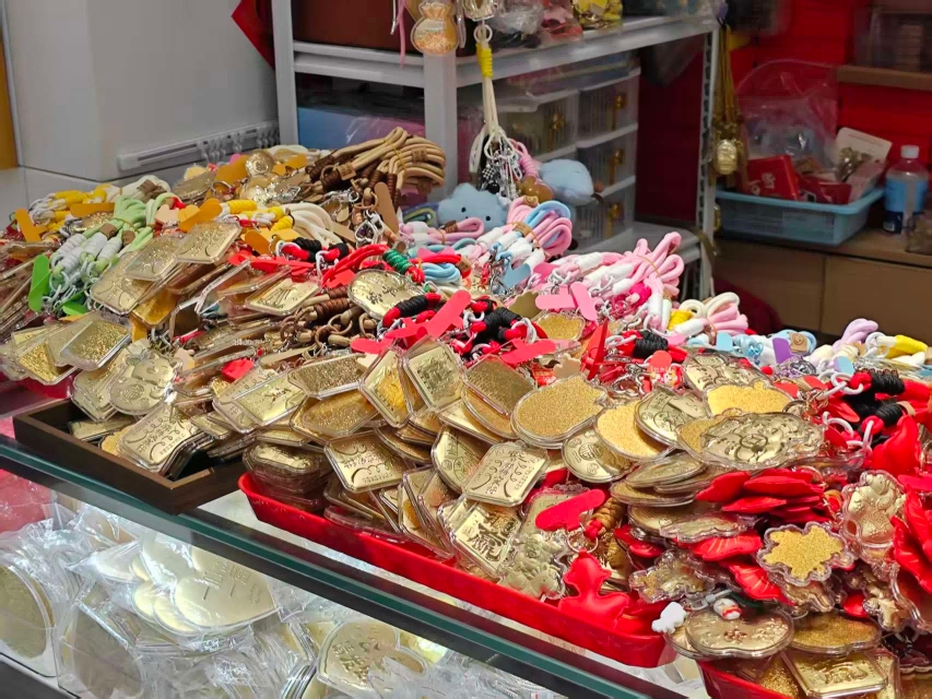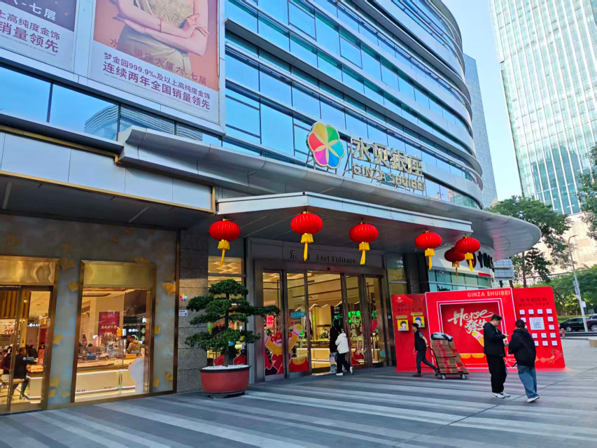 在水贝银座商场一楼和负一楼,仍然有很多黄金店铺和档口,除了小克重的黄金贴纸,许多柜台前新推出了很多黄金贴片挂饰,样式既有十二生肖和恭喜发财等,也有许多市面上受欢迎的哆啦A梦、LABUBU等IP形象,单价根据黄金贴片克重有所不同。