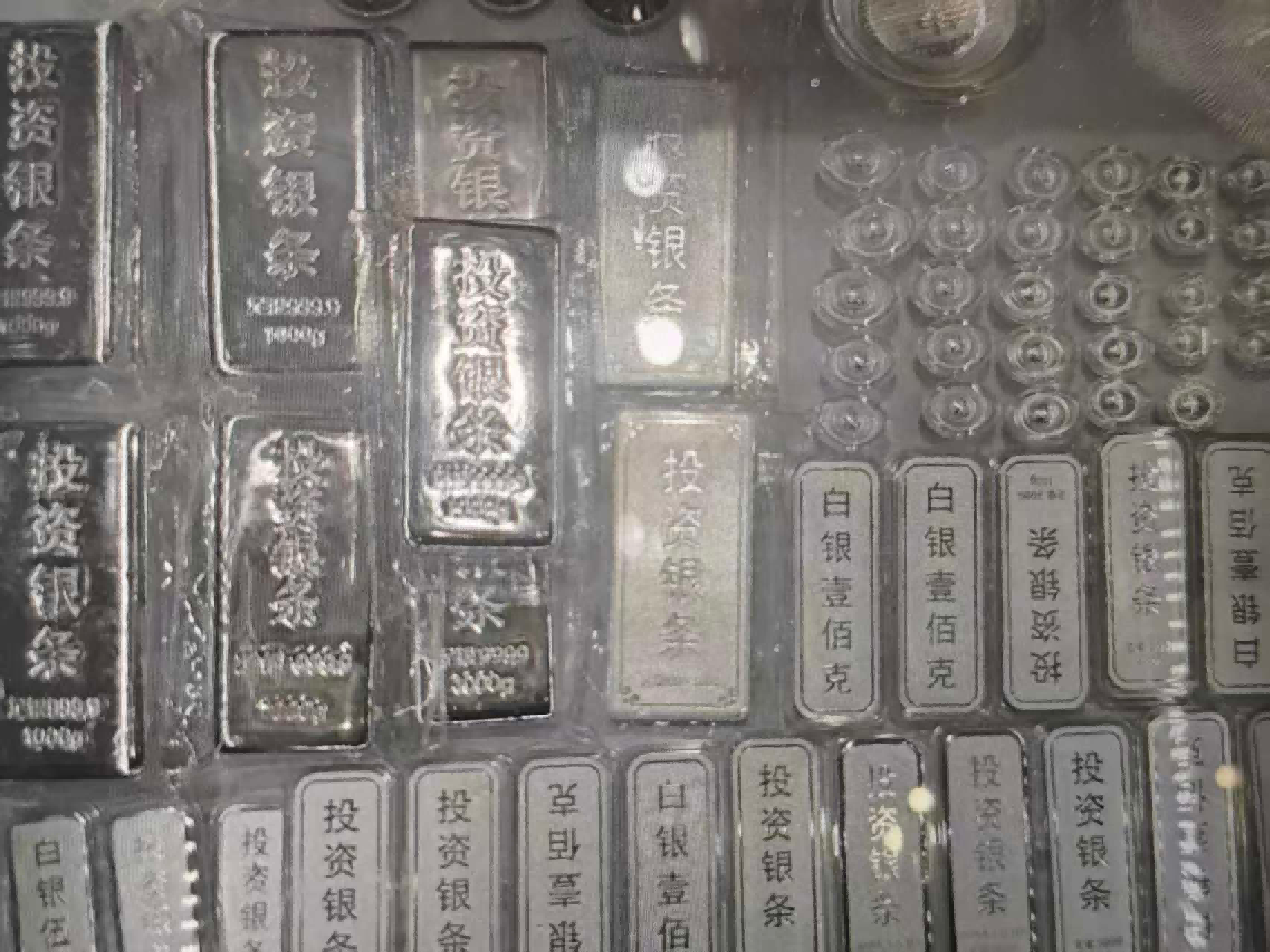 值得注意的是,目前水贝实物白银短缺的情况出现明显的转变。在水贝银座负一楼的银饰店铺及柜台,多个商家在柜台上摆出了不同克重的投资银条、银锭、银纪念币等实物白银。