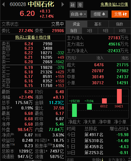 【大河财立方消息】1月9日,中国石化集合竞价阶段涨停。开盘后,中国石化股价跳水,截至发稿,涨幅回落至2.14%,市值7497亿元。