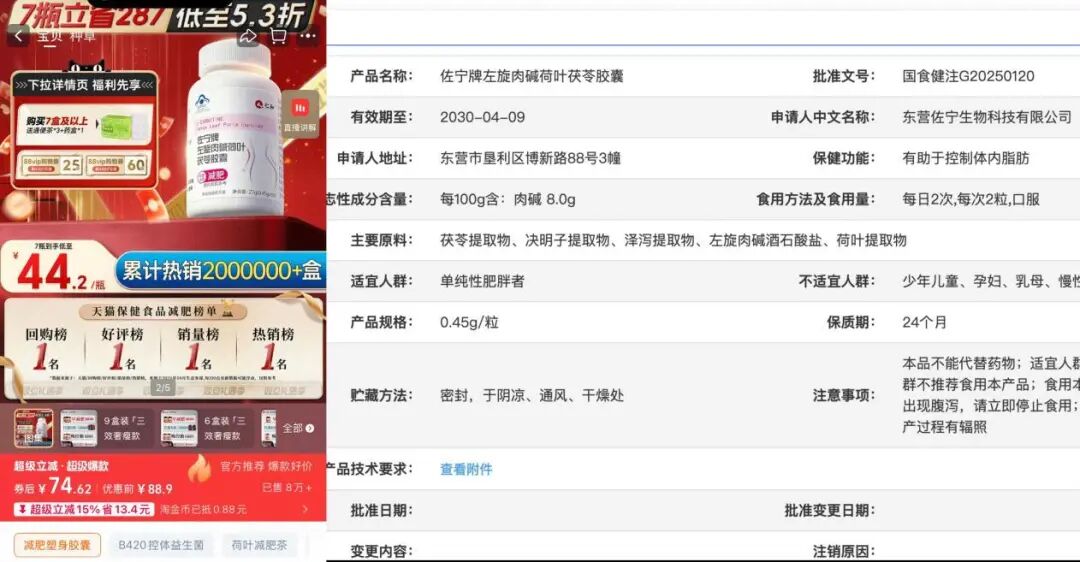 国家市场监督管理总局官网显示,佐宁牌左旋肉碱荷叶茯苓胶囊的申请人为东营佐宁生物科技有限公司。