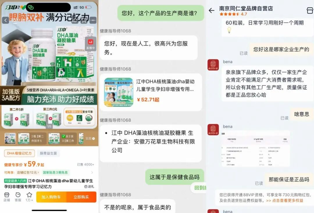 以“DHA藻油凝胶糖果”为例,该产品在电商平台上赟德大药房旗舰店、阿里健康大药房、华夏安康大药房旗舰店、南京同仁堂品牌自营店等有售,商标名为“江中”,售价在50元左右。在阿里健康大药房,江中DHA藻油凝胶糖果销售超四千件,还入选了淘宝DHA自营热销榜,排名第15。