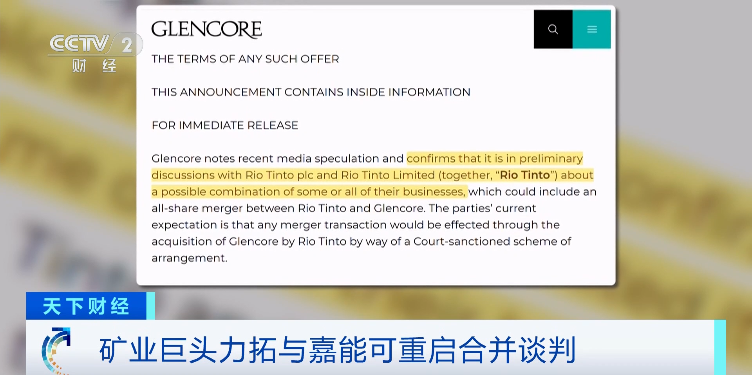 当地时间周四,两家公司分别确认,双方正就“部分或全部业务的潜在合并”展开初步讨论,其中可能包括力拓和嘉能可之间的全股票合并。不过在《金融时报》披露相关谈判后不久,双方同时也强调,目前尚不确定是否会达成任何交易。