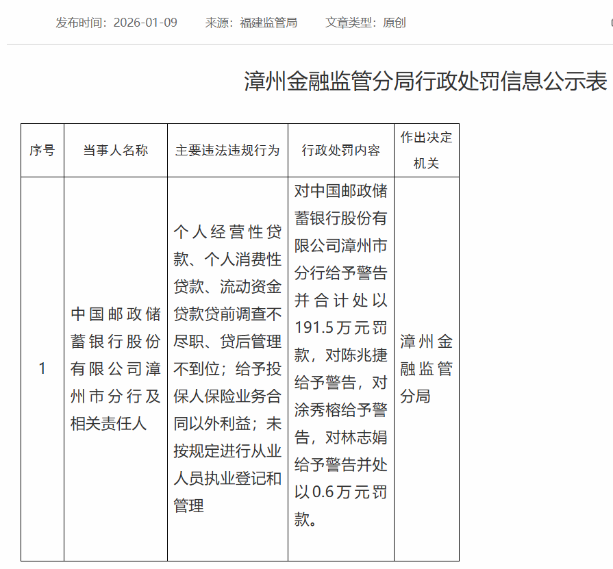 【大河财立方消息】1月9日消息,漳州金融监管分局披露的行政处罚信息公示表显示,中国邮政储蓄银行股份有限公司漳州市分行被警告,并罚款191.5万元。
