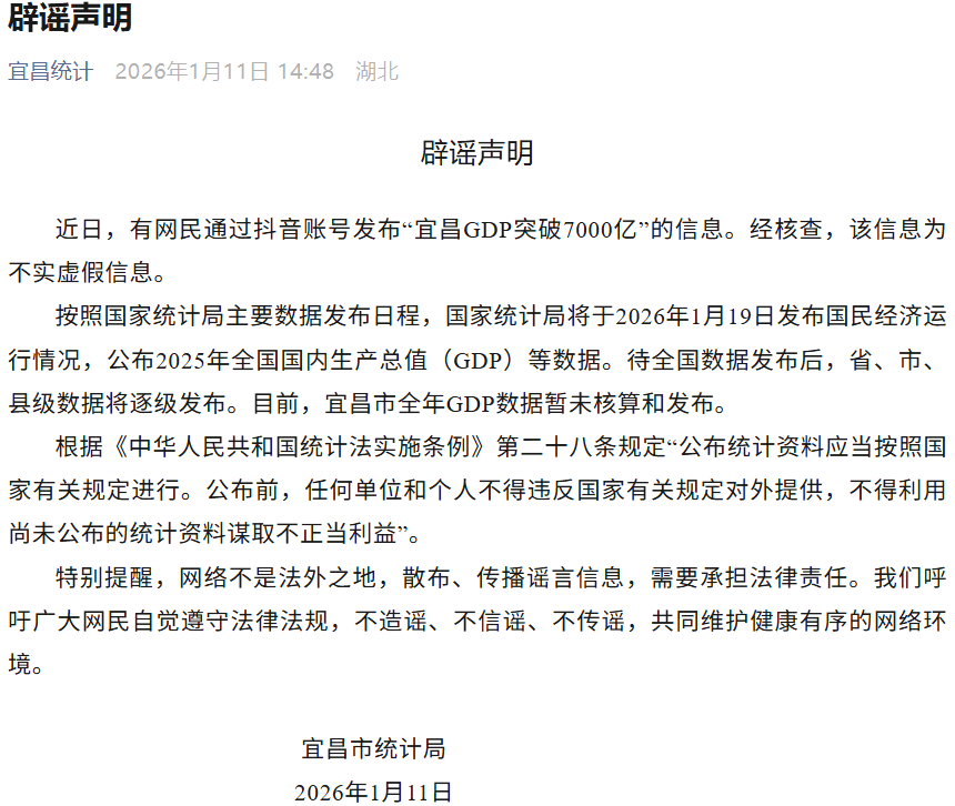 声明中提到,按照国家统计局主要数据发布日程,国家统计局将于2026年1月19日发布国民经济运行情况,公布2025年全国国内生产总值(GDP)等数据。待全国数据发布后,省、市、县级数据将逐级发布。目前,宜昌市全年GDP数据暂未核算和发布。