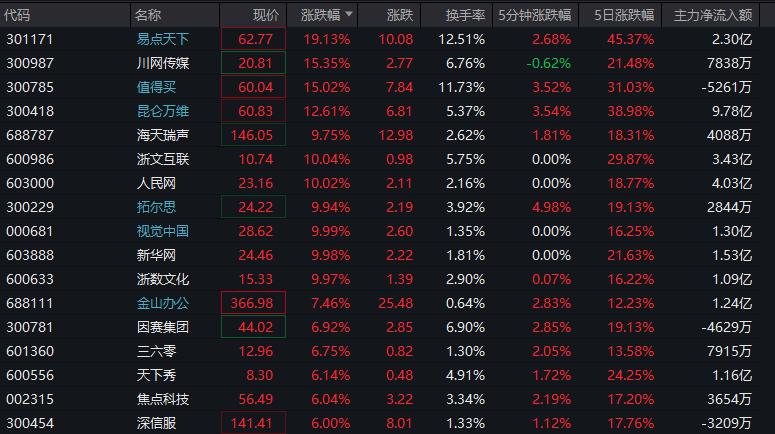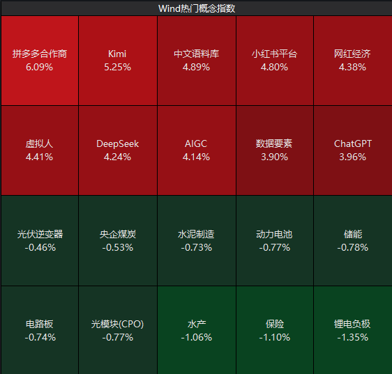 Wind指数涨幅方面,拼多多合作商、Kimi、中文语料库、小红书平台、DeepSeek、网红经济、虚拟人、AIGC等概念涨幅居前。个股方面,易点天下、川网传媒、值得买、昆仑万维、海天瑞声、浙文互联、人民网、拓尔思、视觉中国、新华网、浙数文化、金山办公等大涨。
