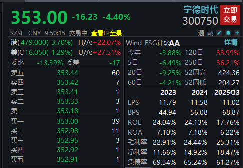 宁德时代开盘持续下挫跌超4%。
