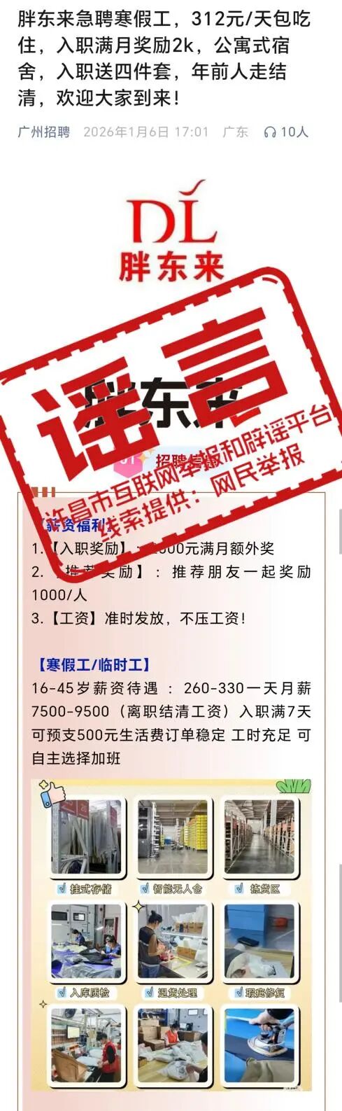 【大河财立方消息】网信许昌消息,近日,某平台账号“广州招聘”发布信息“胖东来急聘寒假工,312元/天包吃住,入职满月奖励2k,公寓式宿舍,入职送四件套,年前人走结清”。经核实,许昌市胖东来商贸集团有限公司近期无此招聘计划,网传信息为谣言。