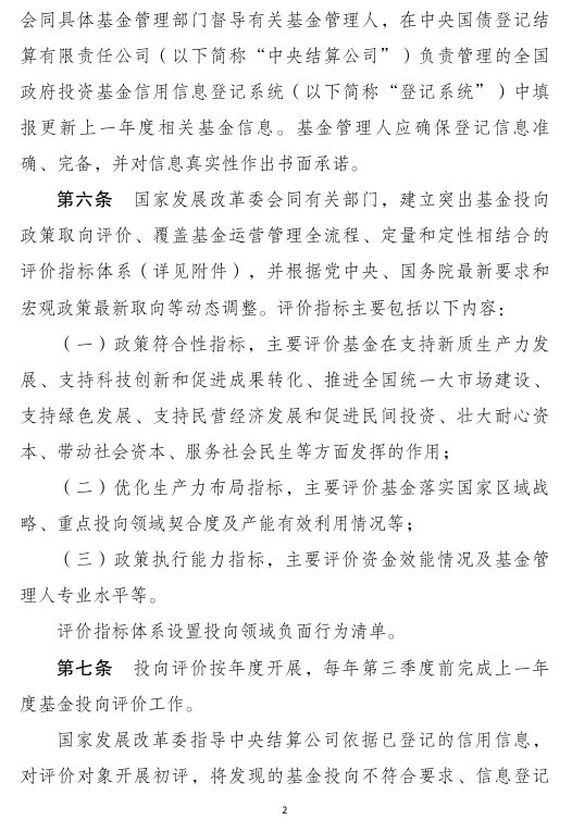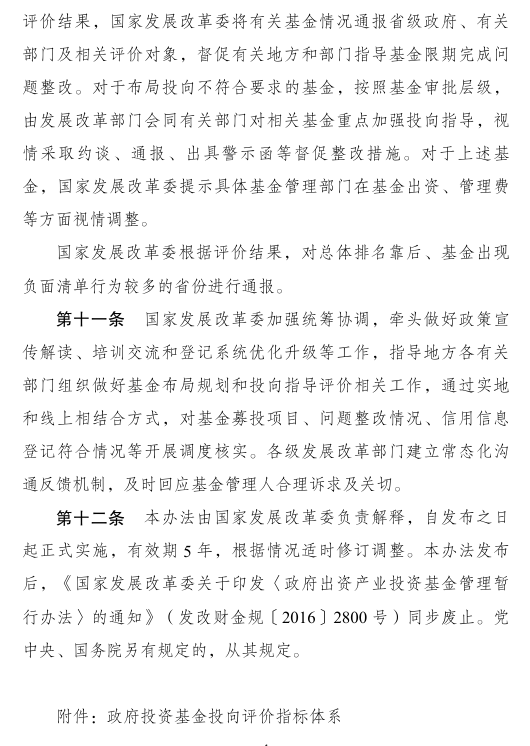 对于出现投向领域负面行为的基金,不予出具投向评价结果,国家发展改革委将有关基金情况通报省级政府、有关部门及相关评价对象,督促有关地方和部门指导基金限期完成问题整改。