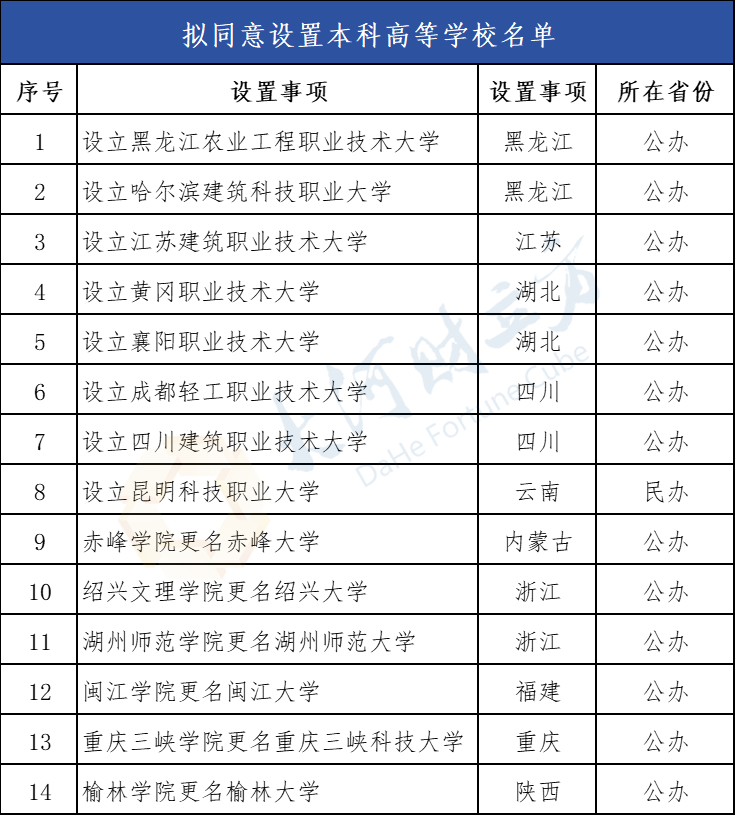 根据《中华人民共和国高等教育法》《普通高等学校设置暂行条例》《普通本科学校设置暂行规定》《本科层次职业学校设置标准(试行)》等有关规定,经教育部党组会议审议,拟同意设置黑龙江农业工程职业技术大学等14所学校,现予公示。