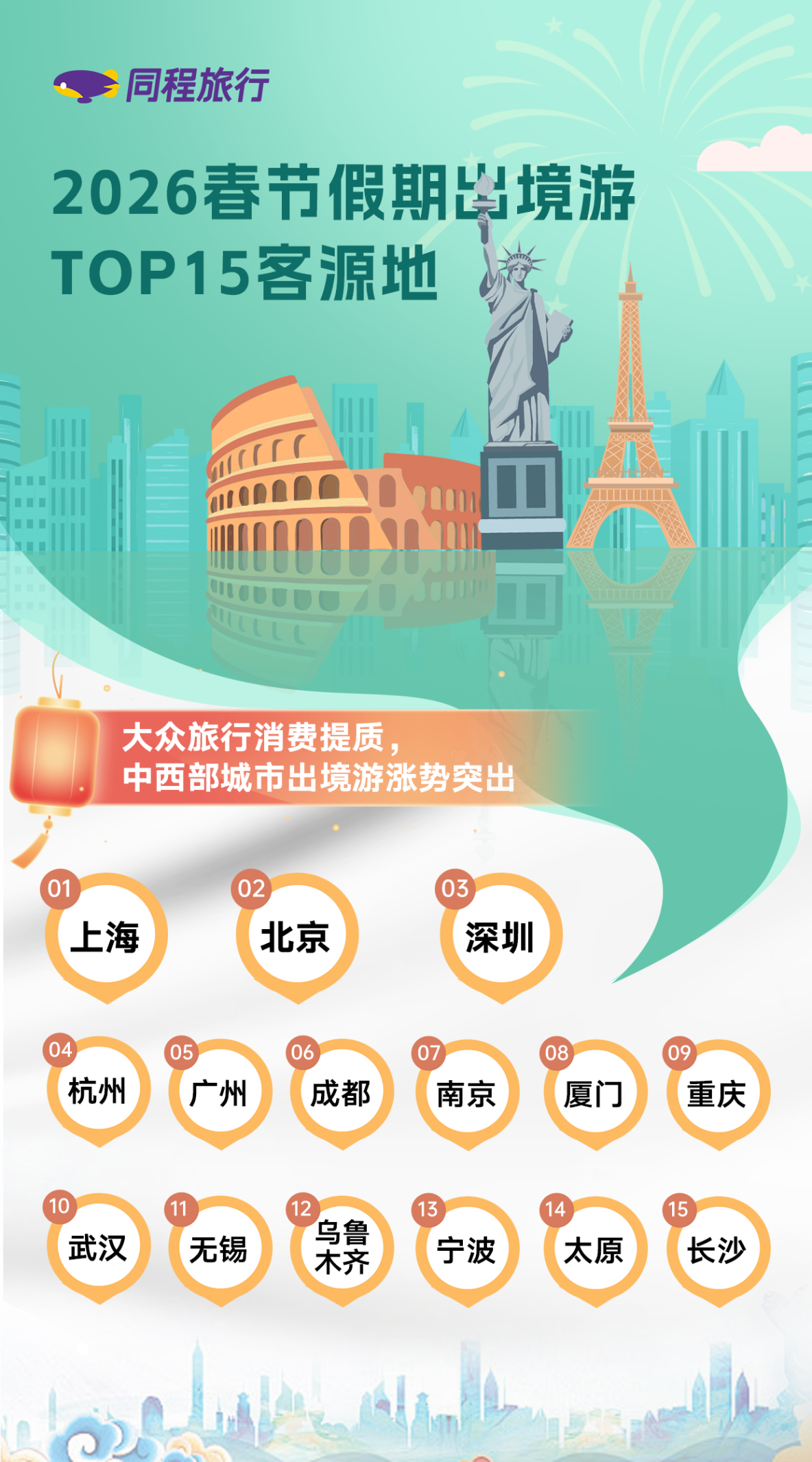 值得注意的是,随着大众旅行消费升级,今年春节假期,非一线城市尤其是中西部城市用户出境游热情高涨。同程旅行数据显示,春节出境游TOP15客源地中,成都、重庆、武汉、乌鲁木齐、太原、长沙等中西部城市纷纷上榜,占比达到四成左右。