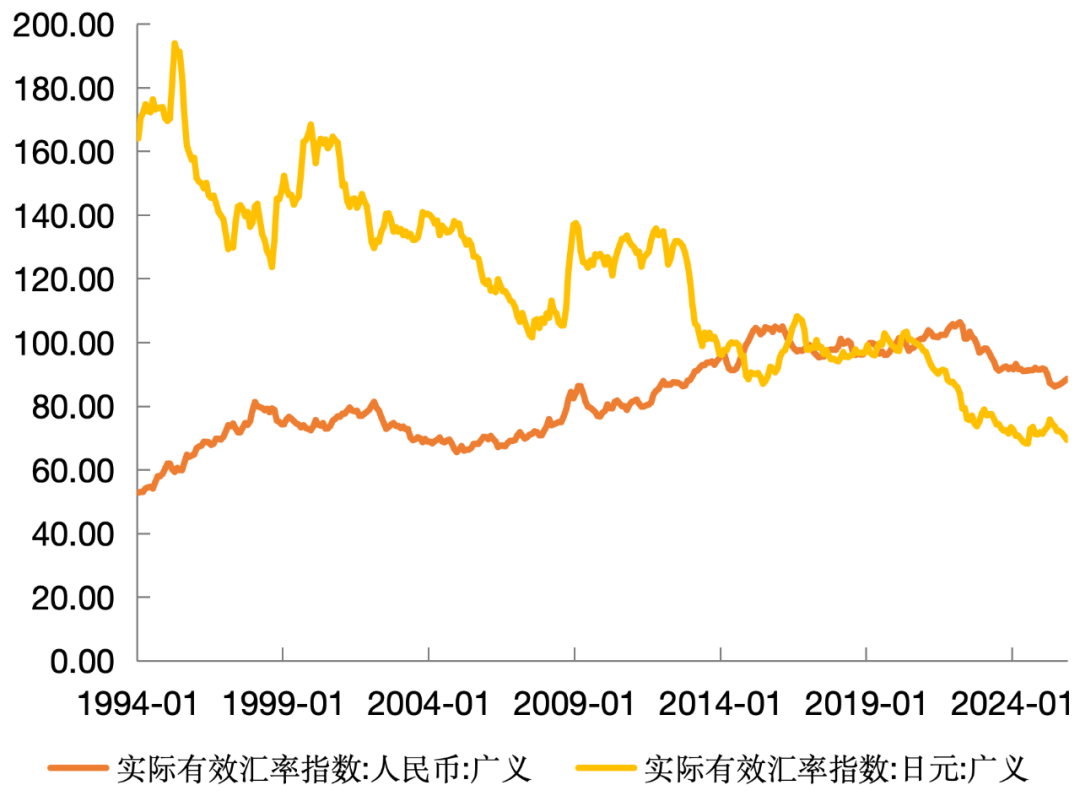 近年来实际有效汇率下跌较多的不只是人民币,还有日元,二者跌幅相仿。国际清算银行(BIS)口径的人民币实际有效汇率自2022年3月见顶回落,到2025年11月累计下跌16.7%,其中2025年前11个月下跌3.2%。同期,可比口径的日元实际有效汇率下跌17.1%,其中2025年前11个月下跌3.4%。人民币实际有效汇率处于2013年以来的低位,而日元实际有效汇率处于1994年以来的低位(见图1)。