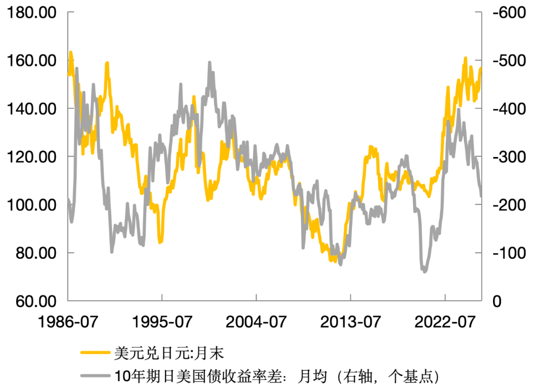 图2 月末日元汇率及月均10年期日美国债收益率差