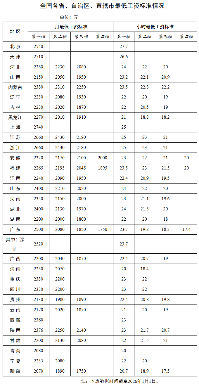 【大河财立方消息】1月13日,人力资源和社会保障部公布全国各省、自治区、直辖市最低工资标准情况(截至2026年1月1日)。