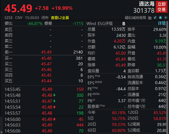 通达海股票交易于2026年1月9日、1月12日、1月13日连续三个交易日内日收盘价格涨幅偏离值累计达到30%,根据《深圳证券交易所交易规则》等的有关规定,属于股票交易异常波动的情形。截至今日收盘,通达海报45.49元/股,涨19.99%,已连续两个交易日“20CM”涨停。