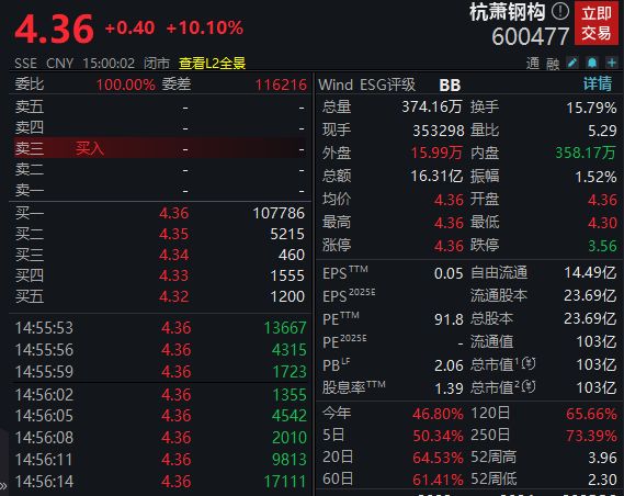 杭萧钢构股票自2026年1月8日起至2026年1月13日连续4个交易日涨停,累计涨幅偏离值达到46.80%,显著偏离大盘指数。2026年1月13日,公司股票换手率较高,达15.79%,明显放量,交易风险较大。公司股价短期波动幅度较大,已明显偏离市场走势,存在较高的炒作风险,目前公司股价已严重偏离上市公司基本面,未来存在快速下跌的风险。截至今日收盘,杭萧钢构报4.36元/股,涨10.1%。