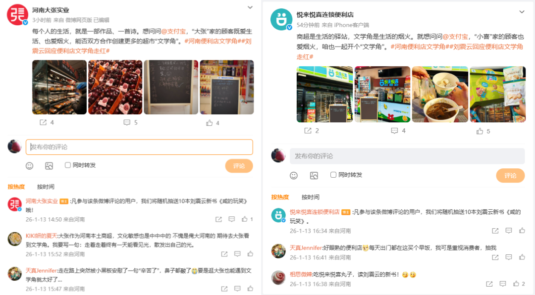 【大河财立方 记者 陈薇】2026年新年伊始,一场温暖的文学互动在河南街头的便利店里悄然蔓延。此事的缘起是河南网友在支付宝评论区的一则“许愿”:希望将走红的“便利店文学”落地家乡,并联动本土作家打造专属城市记忆。这份真挚的提议迅速得到支付宝响应,很快便携手河南籍茅盾文学奖得主刘震云,在郑州、洛阳等十座城市的美宜佳便利店,共同开辟了一方小巧而温暖的“便利店文学角”。