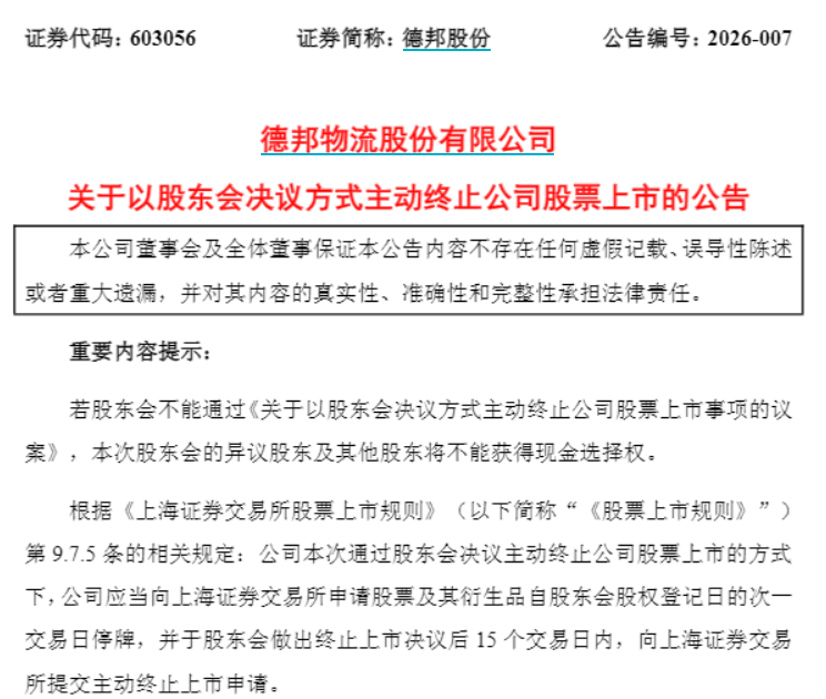 1月13日晚间,德邦物流股份有限公司(证券简称:德邦股份)发布公告称,拟以股东会决议方式主动撤回德邦股份A股股票在上交所的上市交易,并在取得上交所决定后申请在全国中小企业股份转让系统退市板块继续交易。公司股票于2026年1月14日(星期三)开市起复牌。