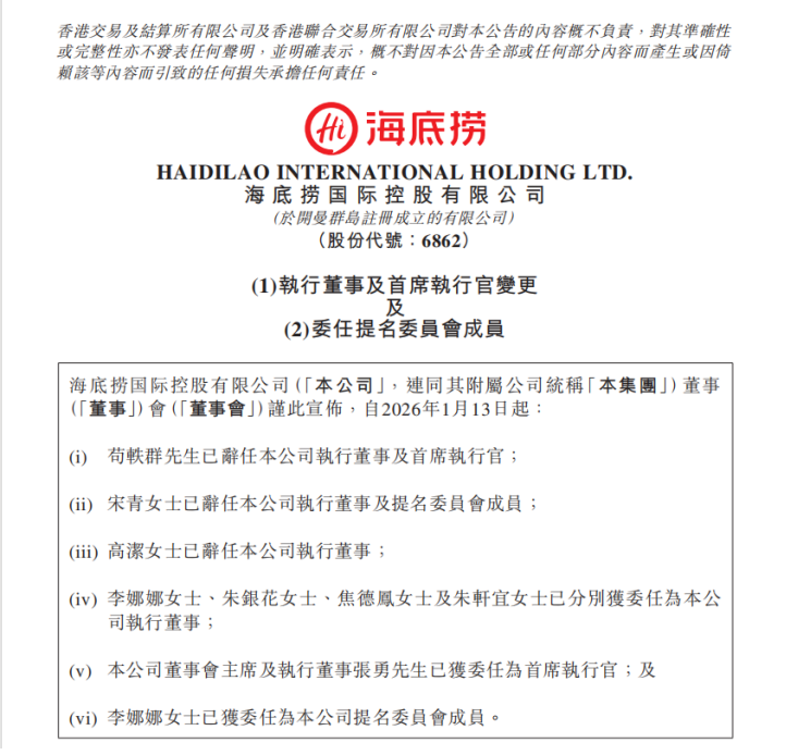 关于管理层变动的核心因素,海底捞方面告诉大河财立方记者,此次管理层及董事会调整,主要是为支持公司持续创新及长期发展,磨砺并培养年轻一代管理团队。4位新任执行董事均长期在集团体系内成长,分别来自区域运营管理、产品与供应链管理及集团战略支持等岗位,具备较为完整的一线经营与管理经验。