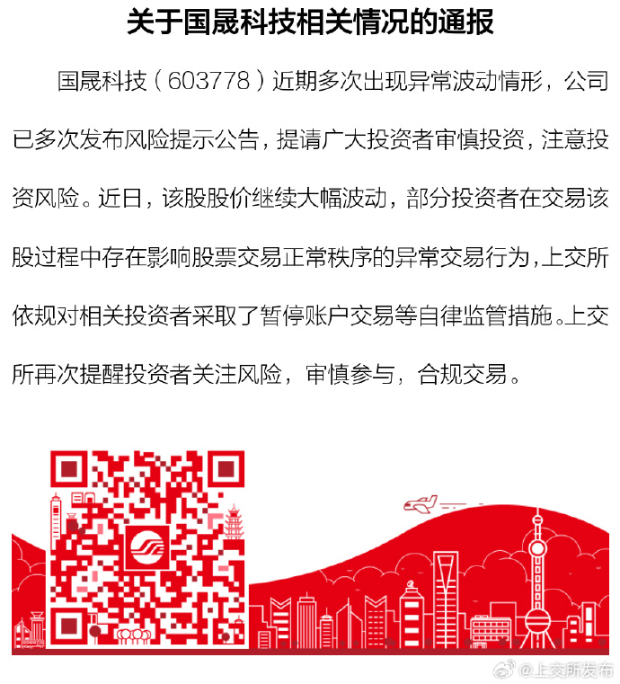 【大河财立方消息】1月14日,上交所发布通报,国晟科技(603778)近期多次出现异常波动情形,公司已多次发布风险提示公告,提请广大投资者审慎投资,注意投资风险。近日,该股股价继续大幅波动,部分投资者在交易该股过程中存在影响股票交易正常秩序的异常交易行为,上交所依规对相关投资者采取了暂停账户交易等自律监管措施。上交所再次提醒投资者关注风险,审慎参与,合规交易。