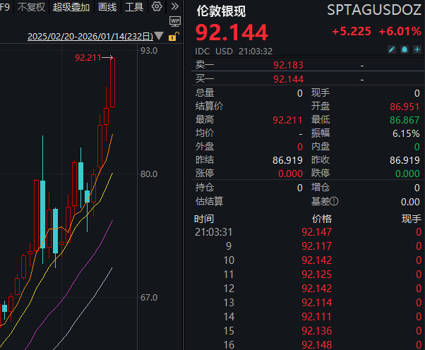 【大河财立方 记者 陈玉尧】1月14日,白银现货再度大涨,盘中涨超6%,报92.144美元/盎司,创历史新高。