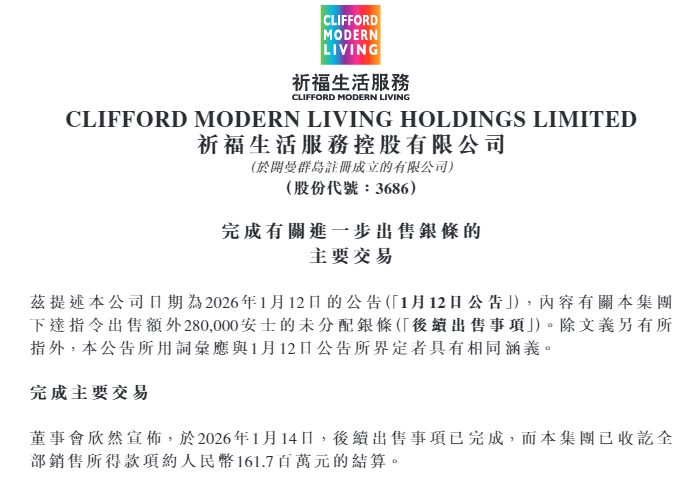 此前,1月9日,祈福生活服务曾公告称,完成出售400,000盎司未分配银条,总代价约为人民币2.262亿元。