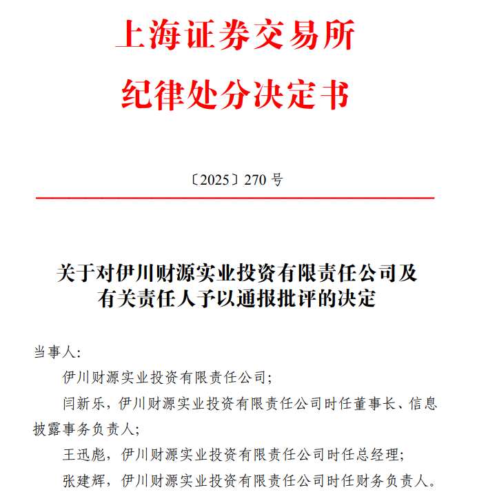 【大河财立方消息】1月15日,上交所公告,对伊川财源实业投资有限责任公司(简称伊川财源投资)及时任董事长闫新乐,时任总经理王迅彪,时任财务负责人张建辉予以通报批评。