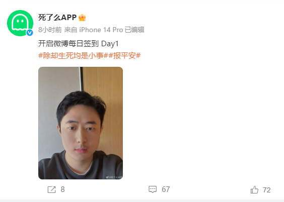 15日,“死了么APP”账号发帖称,开启微博每日签到Day1,并附上“除却生死均是小事”“报平安”的话题,配了一张自拍照。