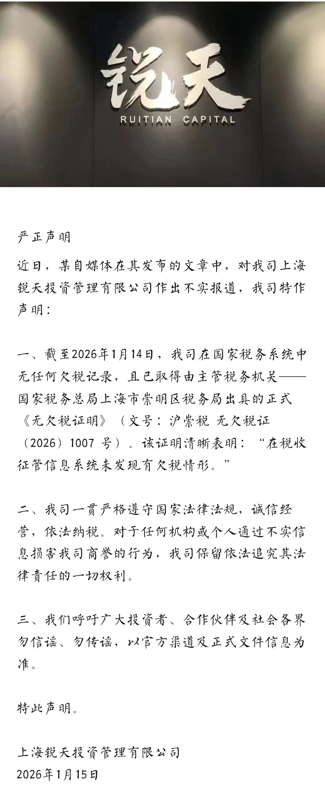 【大河财立方消息】1月15日,上海锐天投资管理有限公司(以下简称锐天投资)发布声明,回应近期有关公司欠税的相关自媒体报道。
