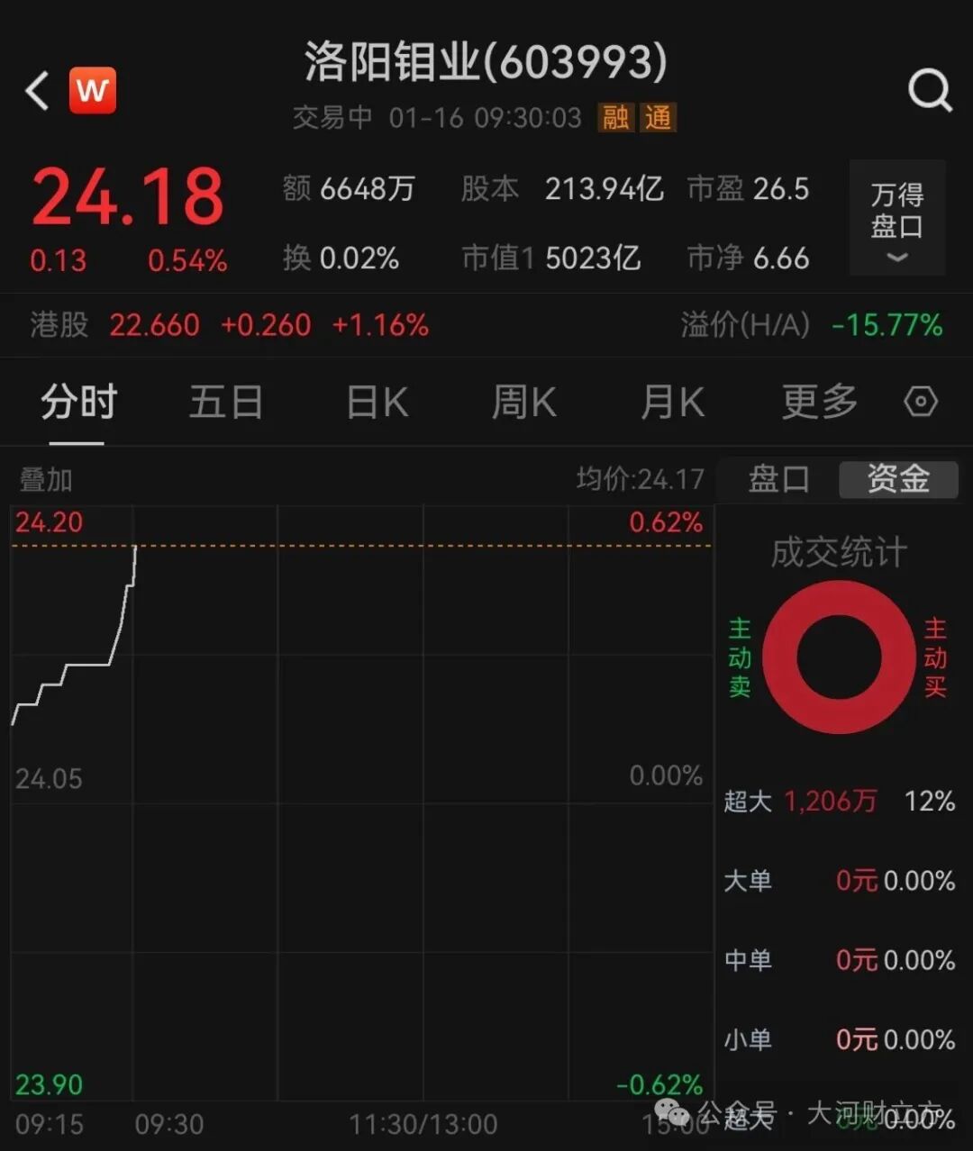 【大河财立方 记者 徐姣】在有色金属价格持续走强、业绩预喜的背景下,1月16日,洛阳钼业股价开盘即拉升,总市值突破5000亿元大关。