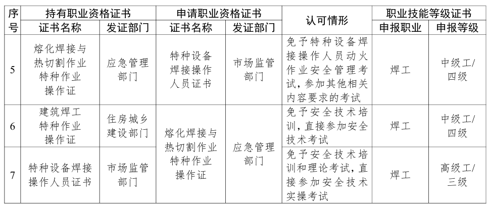 (二)推进焊工职业资格证书互通互认。取得应急管理部门颁发的合法有效的熔化焊接与热切割作业特种作业操作证的人员,在向颁发建筑焊工特种作业操作证地区的住房城乡建设主管部门申请相应操作证时,可免予安全作业培训,直接参加建筑焊工特种作业人员考核;在申请市场监管部门特种设备焊接操作人员证书时,可免予特种设备焊接操作人员动火作业安全管理考试,参加其他相关内容要求的考试。取得住房城乡建设部门颁发的合法有效的建筑焊工特种作业操作证的人员,在申请应急管理部门熔化焊接与热切割作业特种作业操作证时,可免予安全技术培训,直接参加安全技术考试。取得市场监管部门颁发的合法有效的特种设备焊接操作人员证书的人员,在申请应急管理部门熔化焊接与热切割作业特种作业操作证时,可免予安全技术培训和理论考试,直接参加安全技术实操考试。参见附件中序号4—7。