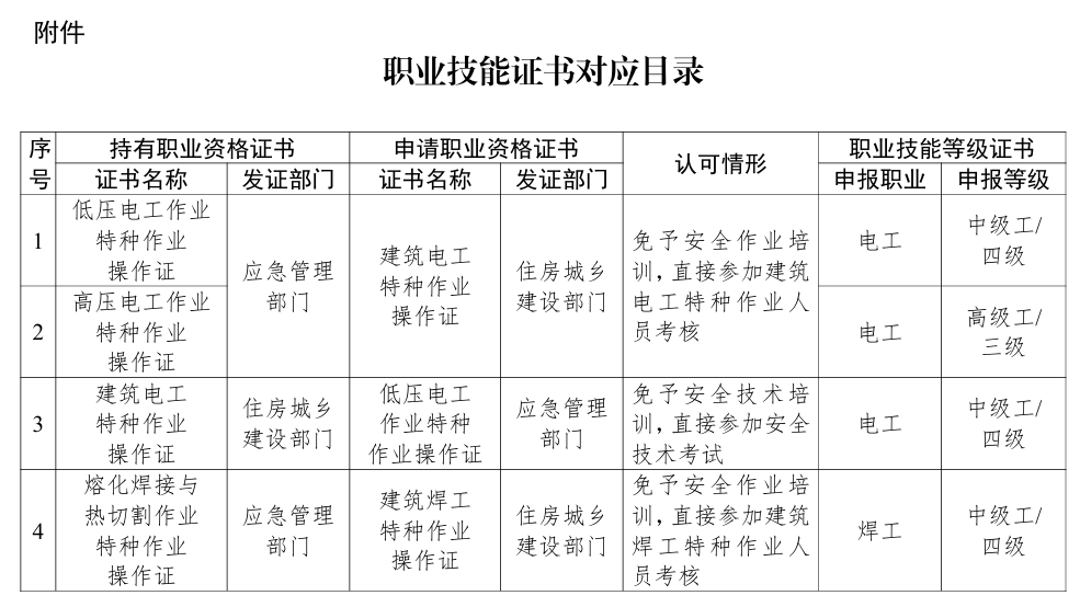(一)推进电工职业资格证书互通互认。取得应急管理部门颁发的合法有效的低压电工作业、高压电工作业特种作业操作证的人员,在向住房城乡建设部门申请建筑电工特种作业操作证时,可免予安全作业培训,直接参加建筑电工特种作业人员考核。取得住房城乡建设部门颁发的合法有效的建筑电工特种作业操作证的人员,在申请应急管理部门低压电工作业特种作业操作证时,可免予安全技术培训,直接参加安全技术考试。参见附件中序号1—3。