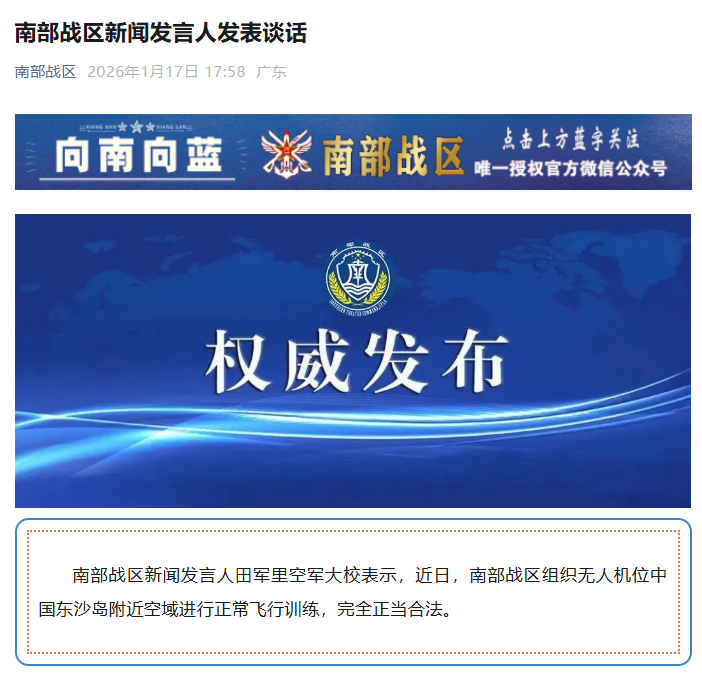 南部战区新闻发言人田军里空军大校表示,近日,南部战区组织无人机位中国东沙岛附近空域进行正常飞行训练,完全正当合法。