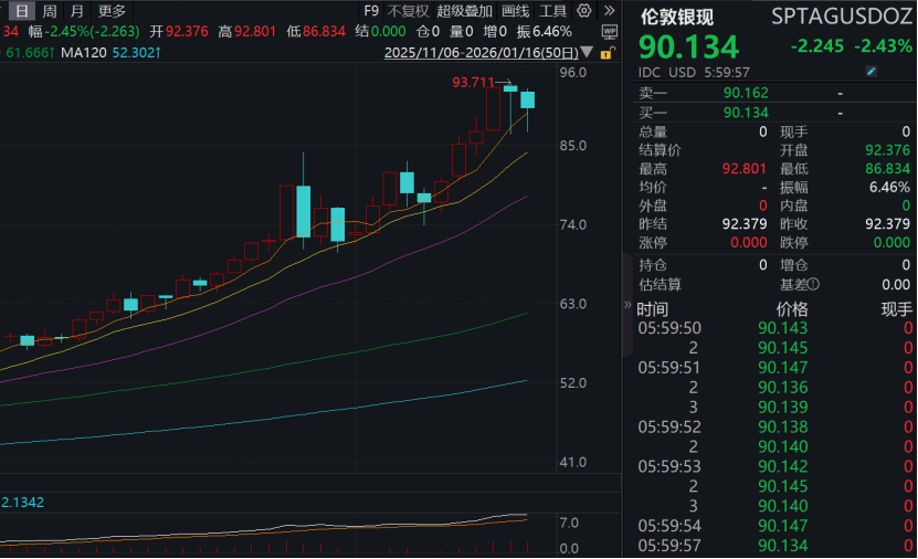 在经历了前期的疯狂上涨后,最近两个交易日,白银价格大幅波动。周四(1月15日)盘中,现货白银一度触及93.71美元/盎司的历史新高,但随后大幅跳水,盘中跌幅一度超过7%,当天收盘时跌幅收窄至0.65%;周五(1月16日),现货白银再度出现跳水行情,盘中跌幅一度超过6%,收盘时下跌2.43%,险守90美元/盎司关口。